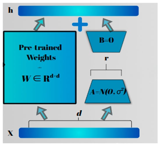 Since B = 0 at initialization, the model begins as original to pre-trained model, and only the low-rank parameters A and B are being updated through the fine-tuning, while the original weights W remain frozen as shown in Equation (3).