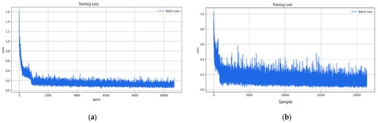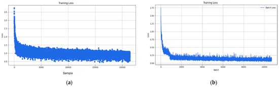 Training loss curves for the AdamW optimizer: (a) loss curve batch size 8 (batch-wise), (b) loss curve batch size 4 (sample-wise).