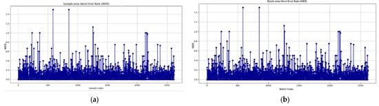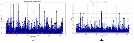 Figure 6 shows that AdamW had generally consistent WER trends under both training settings. The batch-wise setup (batch size 8) resulted in a WER of 7.98%, which performed significantly better than the sample-wise configuration (batch-size 4), which achieved a WER of 8.02%. In spite of its stability, AdamW performed worse than Adam when trained in sample-wise experimental conditions [31].