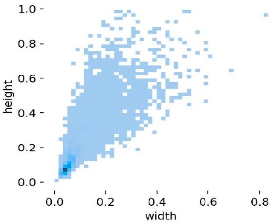 Distribution of Bounding Box Dimensions (Height/Width). The deeper the blue, the more data points there are at that location, indicating a higher density.