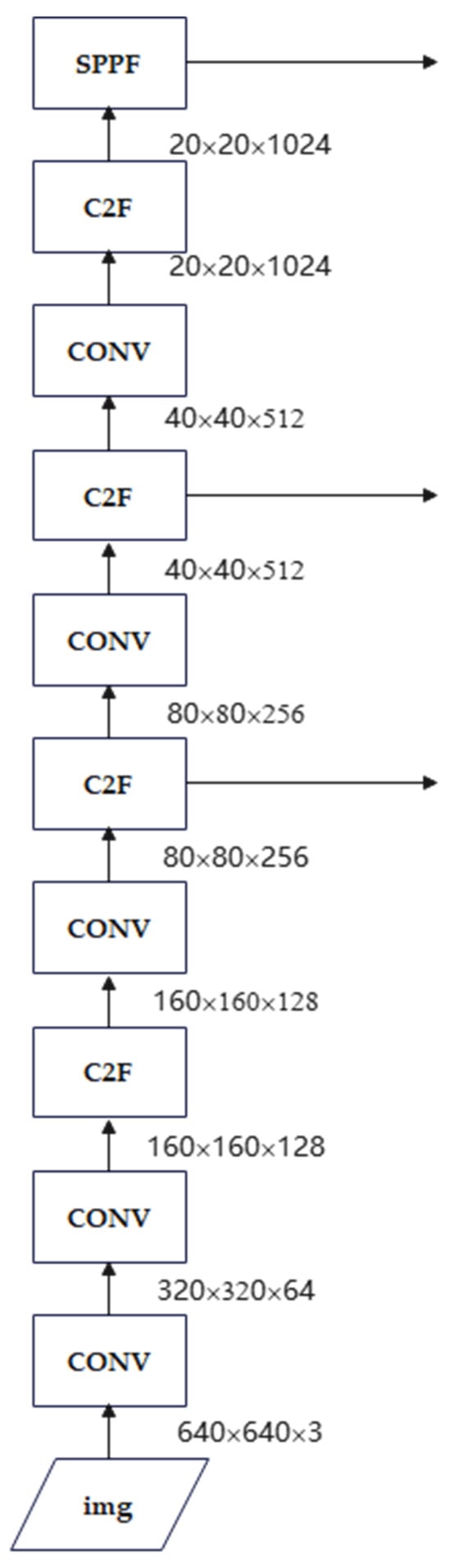 Backbone: It employs a series of convolutional and deconvolutional layers to extract multi-level features, incorporating residual connections and bottleneck structures to reduce computational complexity while preserving high accuracy. At its core, the architecture adopts the C2f module as the primary building block. Compared with the C3 module used in YOLOv5, the C2f module offers fewer parameters while enhancing feature extraction efficiency. The backbone of YOLOv8 is composed of five convolutional blocks, four C2f modules, and one Spatial Pyramid Pooling-Fast (SPPF) module (Figure 4). This design enables the backbone to capture both fine-grained and high-level semantic information, thereby laying a strong foundation for robust object detection.