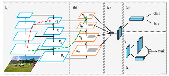 Schematic flow chart of part of Neck. (a) Feature Pyramid Network (FPN) structure; (b) Path Aggregation Network (PAN) structure; (c) Fused feature layers; (d) Detection Head (class: classification prediction branch, box: bounding box prediction branch); (e) Mask prediction branch (mask: mask prediction result).