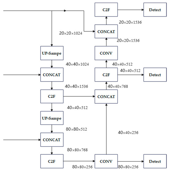 Neck: The Neck module employs a multi-scale feature fusion mechanism to aggregate feature maps from different hierarchical layers of the Backbone, thereby enhancing the model’s overall representational capacity. In YOLOv8, the Neck integrates three key components: the SPPF module for efficient multi-scale context aggregation, the Probability Anchor Assignment module for dynamic and adaptive anchor allocation, and two Path Aggregation Network (PAN) modules for bidirectional feature propagation. These components strike a balance between feature extraction granularity and fusion efficiency, enabling the model to maintain high accuracy when detecting objects across diverse scales. The workflow schematic of the Neck module is illustrated in Figure 5a–c.