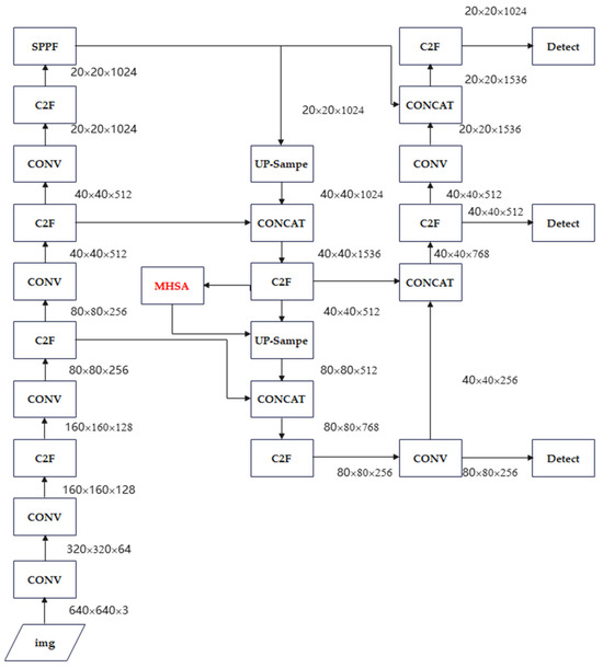 By incorporating the attention mechanism, the model can dynamically reweight feature representations, effectively distinguishing between informative target features and background noise. This enhances the network’s ability to extract meaningful information from feature maps, improving detection accuracy. In this study, we integrate the MHSA block into the YOLOv8 architecture, resulting in an enhanced detection model, termed YOLOv8-MHSA. The network architecture of YOLOv8-MHSA is illustrated in Figure 7. As shown, the MHSA block (highlighted with a red rectangular border) is positioned between the C2f block and the Up-Sample block.