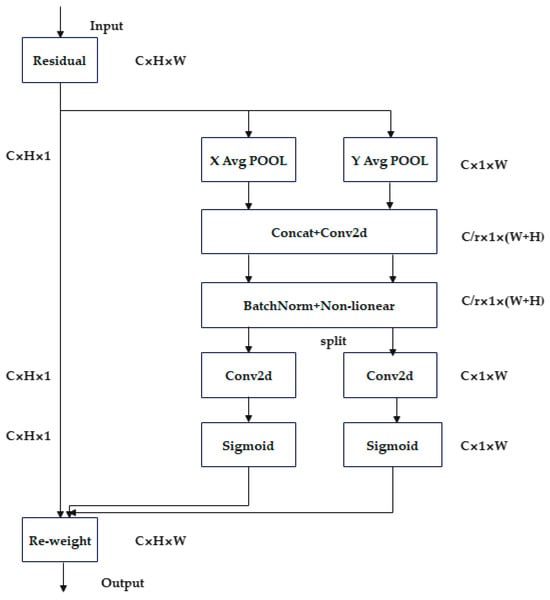 The Channel Attention (CA) mechanism is an advanced deep learning attention approach that incorporates spatial location information into channel-wise feature weighting. It operates in two main steps: first, spatial information is embedded by aggregating features along the vertical and horizontal directions using 1D global pooling; second, an attention map with spatial orientation awareness is generated and applied to the original feature map, emphasizing salient representations. The CA mechanism is illustrated in Figure 8. Specifically, given an input feature map of size [C, H, W], the spatial information is decomposed along the height and width dimensions through separate average pooling operations. Pooling along the width generates a C × H × 1 feature map, while pooling along the height yields a C × 1 × W feature map. These directional features are concatenated to form a C × 1 × (H + W) feature map, which is then processed through a shared 1 × 1 convolutional layer with channel reduction (C/r), followed by batch normalization and a non-linear activation. The processed feature map is split back into height (C/r × 1 × H) and width (C/r × 1 × W) components. Each branch undergoes an independent 1 × 1 convolution, followed by a sigmoid activation, producing attention weights for the height dimension ([C, H, 1]) and width dimension ([C, 1, W]). Finally, these attention weights are multiplied with the original feature map, effectively implementing the CA mechanism and enhancing the network’s ability to selectively focus on important features across both spatial dimensions during the recognition process.