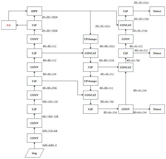 The standard CA module is inserted after the deepest C2f block and before the SPPF block, as illustrated in Figure 9. The CA block receives an input feature map