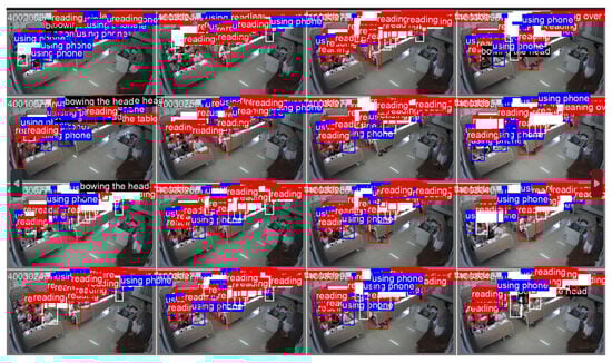 The detection results of YOLOv8-CA and YOLOv8-MHSA are presented in Figure 11 and Figure 12, respectively. The majority of student classroom behaviors are accurately identified, demonstrating the effectiveness of the enhanced attention mechanisms in capturing diverse and complex student actions. However, the models frequently fail to detect several students who are partially or completely occluded by objects or other students. For example, in images such as 40030210.jpg and 40020097.jpg, students sitting in back rows or behind classroom obstructions often remain undetected, especially when only small body parts (e.g., heads or shoulders) are visible. Detecting distant, small-scale students remains a significant challenge for the models. In cases such as 3001359.jpg and 1257022.jpg, students with minimal pixel area are missed, especially when they exhibit subtle behaviors. Non-standard postures (e.g., students leaning down, turning sideways, or adopting unusual sitting positions) in images like 3005164.jpg are sometimes misclassified or missed entirely. This indicates that the models fail to generalize to highly diverse human poses.