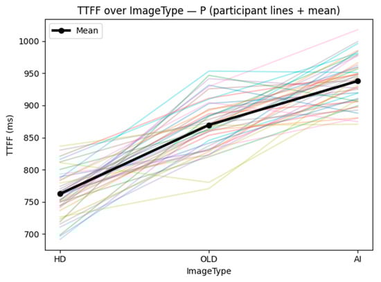 Geometric mean time to first fixation (TTFF, ms) to the area of interest (AOI) of a slogan as a function of image type under positive (P) slogans. Thin black line shows one participant’s geometric mean TTFF (milliseconds) to the slogan AOI for hand-drawn (HD), older stock/archival (OLD), and AI-generated (AI) images; the bold black line represents the absolute across-participant mean. Lower values reflect quicker absolute orienting.