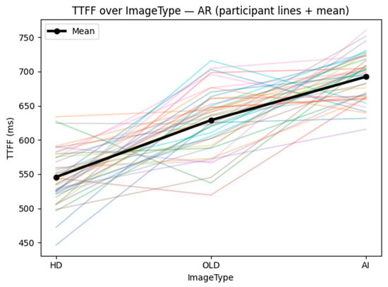 The participant traces in both panels move in the direction HD → OLD → AI, progressively slower orienting with stock and AI images; this replicates the large ImageType main effects (HD < OLD < AI). Maybe most notably, the AR panel (Figure 2) is lower than the P panel (Figure 1) for all image types, as would be expected for a ~30–40% AR benefit (TR ≈ 1/1.41) and for additivity over moderation. The approximately parallel slopes between panels indicate the non-significant Slogan × ImageType interaction: image type moves the baseline (vertical positioning of the lines), but AR yields a relatively stable gain on HD, OLD, and AI. Within condition, thin participant lines converge near the bold mean with similar ordering (HD is fastest; AI is slowest) and demonstrate that the group pattern is not the result of the inclusion of a small number of participating subjects. Together, the plots constitute a graphical test of H1 (AR < P in TTFF) and H3 (HD < OLD < AI), and account for why the interaction fell short of significance: the effects are additive rather than multiplicative.
