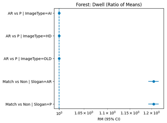 A median quantile regression on log(Dwell) with cluster-bootstrapped CIs showed that P slogans resulted in lower dwell on the slogan AOI compared to AR, b = −0.255, RM = exp(b) = 0.78 [0.76, 0.79] (Table 6). Compared with HD, both OLD and AI reduced dwell: OLD, b = −0.083, RM = 0.92 [0.90, 0.93]; AI, b = −0.206, RM = 0.81 [0.80, 0.83]. A small Slogan × ImageType (AI) interaction was observed, b = 0.031, RM = 1.03 [1.01, 1.05] (Table 6), indicating the AR advantage is slightly attenuated for AI relative to HD at the median; the OLD interaction was not significant. These results support H2 (AR > P in dwell), and they show robust image-type differences (HD > OLD > AI) consistent with H4, with only limited moderation by ImageType.