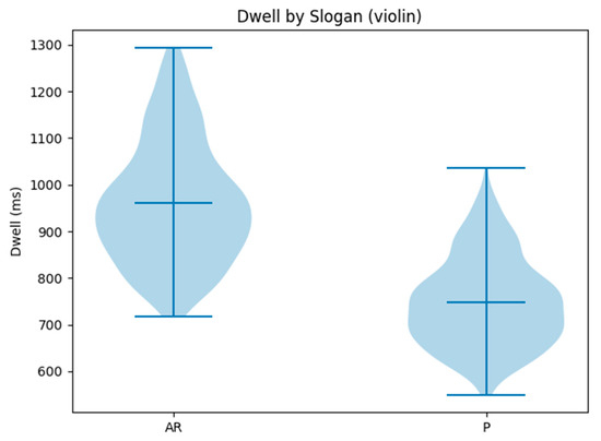 Kernel-density (“violin”) plots of dwell time (ms) on the slogan AOI by SloganType. Distributions (averaged within image types and image populations at the participant-cell level) are shifted toward longer dwell under AR compared to P. Central markers are medians; widths are kernel density. Units: milliseconds.