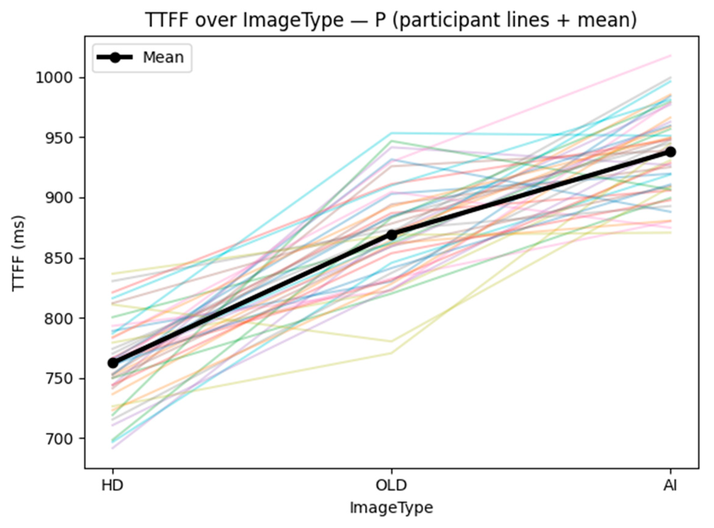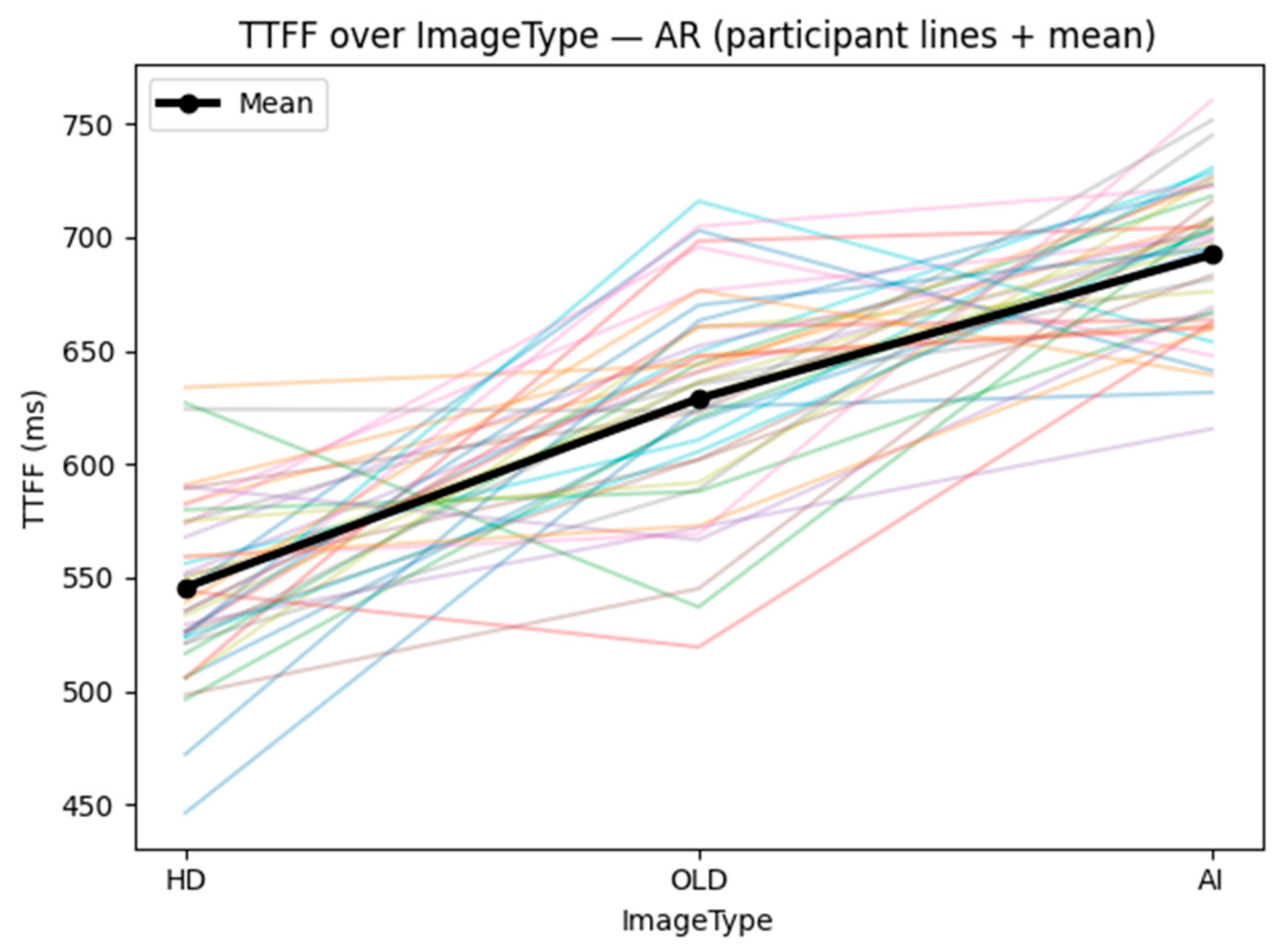 Figure 1) for all image types, as would be expected for a ~30–40% AR benefit (TR ≈ 1/1.41) and for additivity over moderation. The approximately parallel slopes between panels indicate the non-significant Slogan × ImageType interaction: image type moves the baseline (vertical positioning of the lines), but AR yields a relatively stable gain on HD, OLD, and AI. Within condition, thin participant lines converge near the bold mean with similar ordering (HD is fastest; AI is slowest) and demonstrate that the group pattern is not the result of the inclusion of a small number of participating subjects. Together, the plots constitute a graphical test of H1 (AR < P in TTFF) and H3 (HD < OLD < AI), and account for why the interaction fell short of significance: the effects are additive rather than multiplicative.