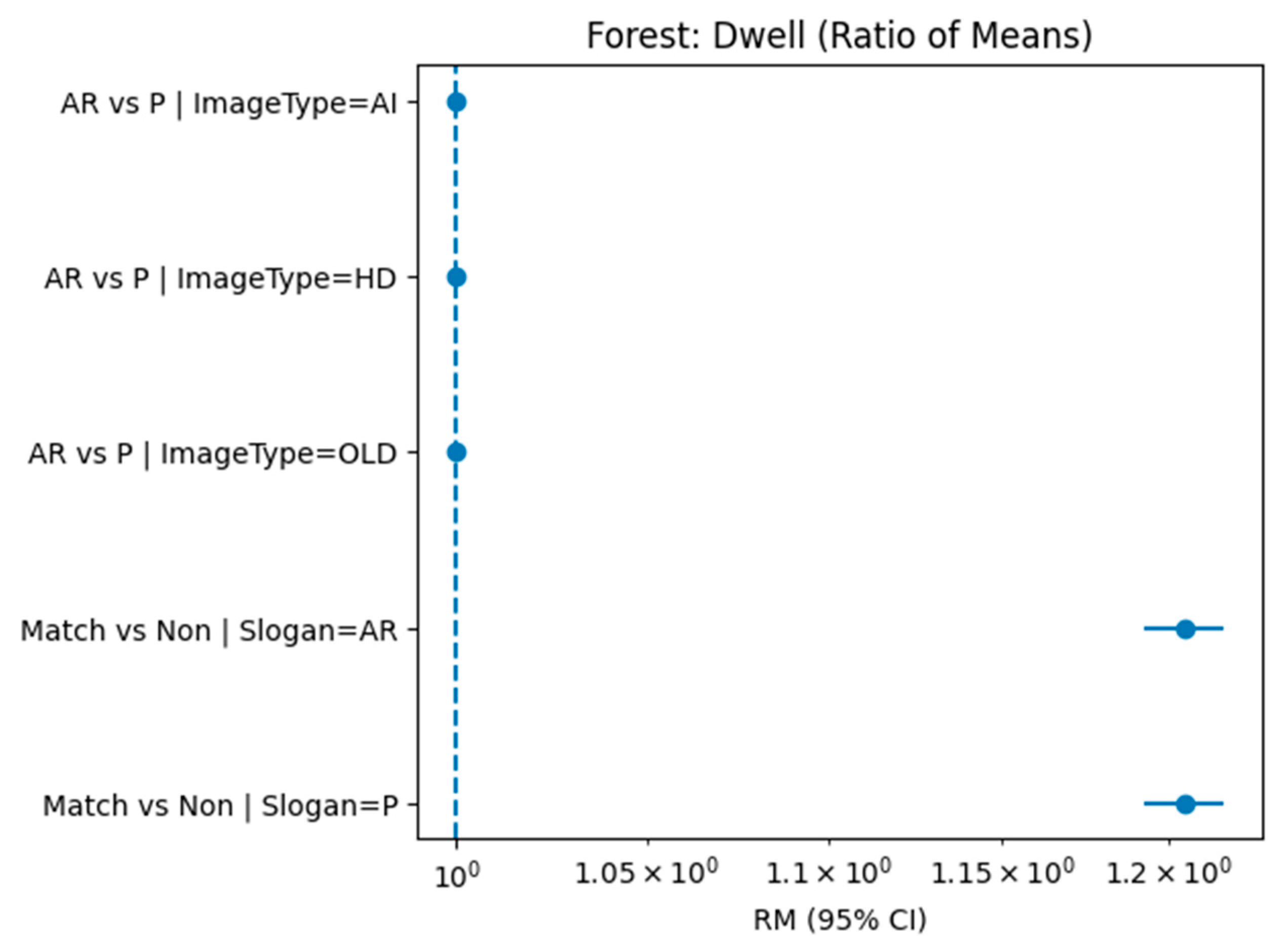Dwell indicates a small but consistent decline in the AR benefit to AI images (P × AI RM ≈ 1.03), while OLD is the same as HD. This is a mirror that image style influences preservation rather than capture: AI imagery exacts light disfluency that cuts—but does not eliminate—the AR benefit. This moderate magnitude of this moderation (≈2–3%) is in line with an additive main effect of framing involving a mild maintenance-stage penalty to AI, and not complete reversal. Combined with the TTFF findings, it accounts for the mixed interaction pattern: AR functions mostly as a framing prior (additive over styles), with image category contributing stage-different baseline shifts and with only modest interaction under prolonged viewing.