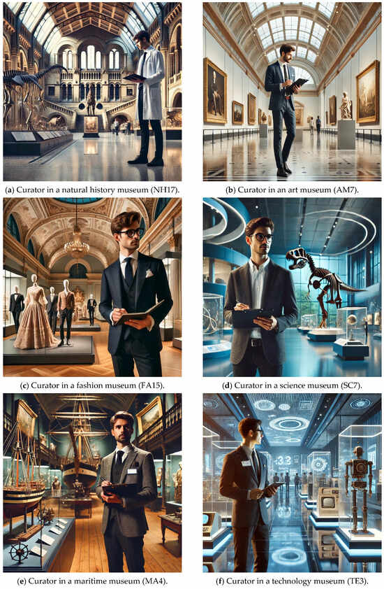 When interpreting a user’s request as written in the prompt, ChatGPT4o is liable to generate a tailored response shaped by linguistic cues that reflect the user’s values and ideological orientations, if these do not contravene the ethical constraints and guardrails imposed by the system provider. To minimize the risk of responses being skewed toward a user’s particular ideological position or the perceptions derived from it, the prompts were deliberately formulated in an unconstrained fashion (zero-shot prompting). ChatGPT4o autogenerated the complex textual prompt injected into DALL-E to render the image. No human manipulation in the image conceptualization and implementation process occurred. The following prompt was used: “Think about [insert museum type] museums and the curators working in these. Provide me with a visualization that shows a typical curator against the background of the interior of the museum.”