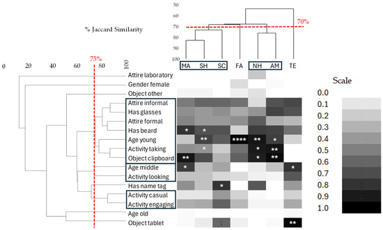 Two-way table showing relationship between attributes (visual scores) of curators generated by AI for images by museum type. Shading scale is the proportion of images within each museum type that have the attribute. Dendrograms show relationships between the attributes (Left) and museums (Top) based on the Jaccard similarity coefficient. Boxes show groups of attributes that have similar occurrence profiles (Left) and museums that have similar attributes (Top) at 75% and 70% similarity, respectively. Asterisks identify attributes that define each museum based on percent contribution to similarity (* ≥ 15%, ** ≥ 20%, **** ≥ 40%).