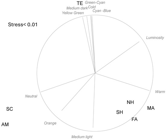 The museum images were also more similar to each other than to those representing other museums (Pseudo F = 55.2, df = 6, 243, p < 0.0001), and, collectively, each museum’s images were on average more similar to other images from the same museum than to other museum types (all p < 0.004). MA museum images were invariant for all attributes except for luminosity. All AM, FA, MA, and SC museums scored medium-light for lightness; MA, NH, and SH museums’ images were all warm in temperature, and all MA images were Red-yellow in hue. TE museums scored much more often for cold, medium-dark, tellow-green, green-cyan, and cyan-blue, making them appear considerably different from all other museum images (Figure 3). AM and SC images were the only ones that scored for neutral temperature, and both also scored regularly for orange hue, and this combination separated them from most other museum image types. NH, SF, FA, and MA museum images were generally associated with warm temperatures, medium light, and higher luminosity images (Figure 3).