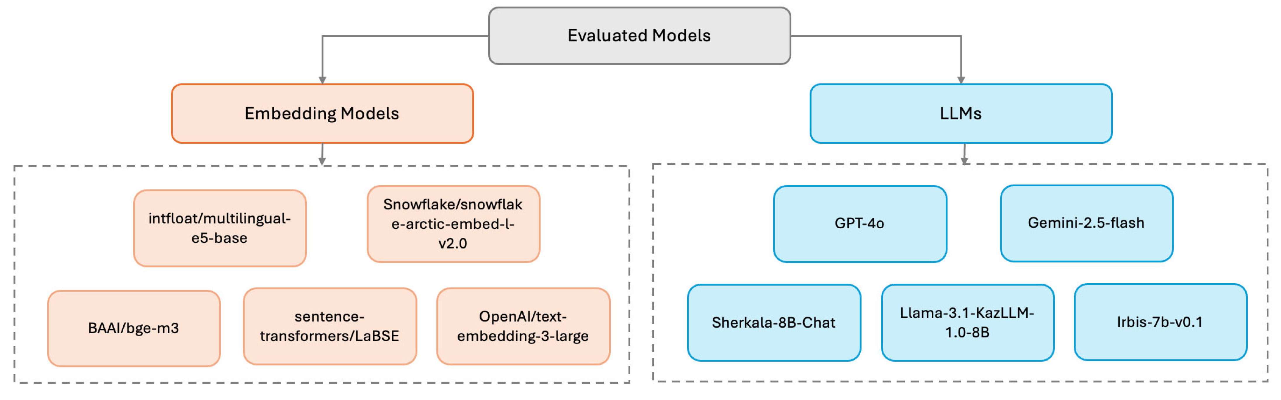 Recent applied studies also highlight the effectiveness of multilingual embeddings and LLM-based approaches in related tasks. Nugumanova et al. [43] demonstrated that global embedding models (BGE-M3, LaBSE), combined with local signals, can successfully address the problem of sentiment analysis of transport complaints in a zero-shot setting and with lightweight fine-tuning. Although this work does not focus directly on QA or the Kazakh language, it underlines the value of incorporating retrieval and embedding components to improve factual accuracy in low-resource scenarios. Similarly, Rakhimzhanov et al. [44] confirmed that the embedding models E5 and BGE-M3, applied in multilingual low-resource settings (in this case, the classification of transport complaints), achieve accuracies of up to 90% even without task-specific training, while being significantly faster and more computationally efficient than LLM-based approaches.