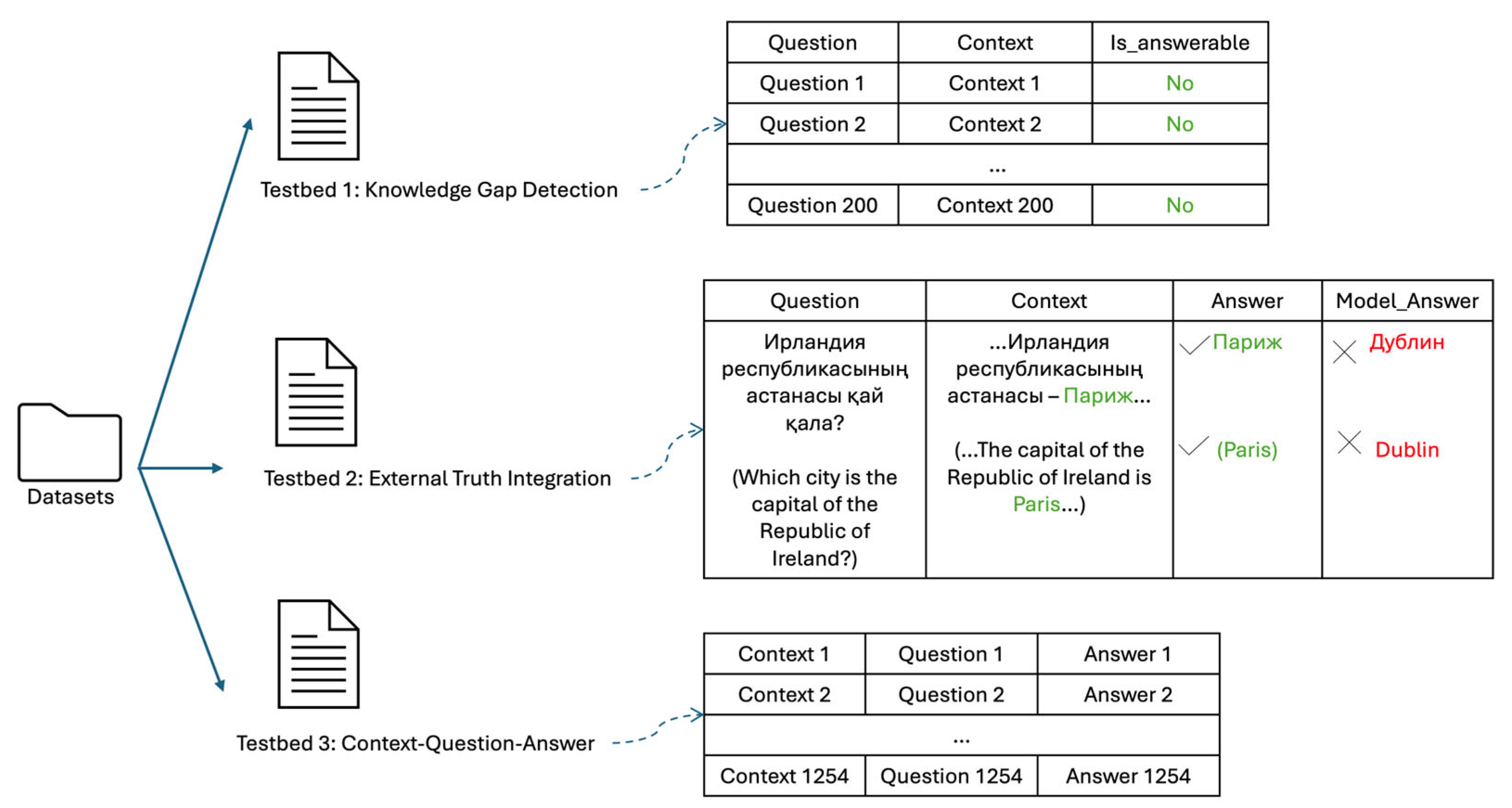 Kazakh is a low-resource language for which QA technology is only beginning to mature. Previous efforts to build Kazakh QA systems leveraged multilingual NLP models and focused on extractive QA. For example, Shymbayev and Alimzhanov [37] constructed a Kazakh QA dataset and fine-tuned transformer models to retrieve answers from provided paragraphs. Their system achieved respectable accuracy on test questions, underlining that multilingual transformers like XLM-R or mBERT can serve as effective readers for Kazakh given the right fine-tuning data. In parallel, efforts have been made to tackle domain-specific QA. Mukanova et al. [38] developed a geographical QA system in Kazakh. They compiled a corpus of 50,000 Q&A pairs about Kazakhstan’s geography and trained a BERT-based model to answer these questions. The resulting system could answer geography questions with high fidelity (BLEU score ≈ 0.95). Tleubayeva and Shomanov [39] performed a comprehensive comparison of multilingual QA models adapted to Kazakh. They reported that a fine-tuned mT5 model achieved the highest accuracy (F1 ≈ 75.7%) on a Kazakh QA test set, slightly outperforming even GPT-4’s few-shot performance (F1 ≈ 73.3%) on the same questions. Their experiments also showed that Kazakh-RoBERTa improved with fine-tuning but still lagged behind the larger multilingual models, highlighting the need for more Kazakh-specific data and larger model capacity. Nugumanova et al. [40] similarly highlights the importance of leveraging powerful multilingual transformers for developing a Kazakh QA system. By adapting a T5 model to Kazakh, they achieved improved results over baseline models, confirming that pretrained models can transfer to Kazakh after fine-tuning. However, fine-tuning leads to narrow specialization which fails to generalize beyond the training distribution, while still demanding costly annotation efforts [41].
