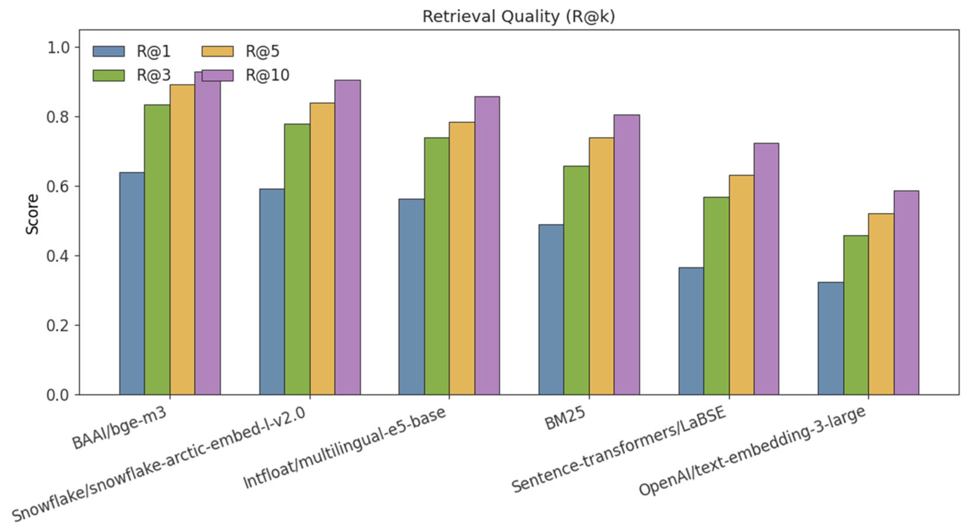 • Recall@k measures the proportion of queries for which at least one relevant passage appears among the top-k (k = 1, 3, 5, 10) retrieved results.
