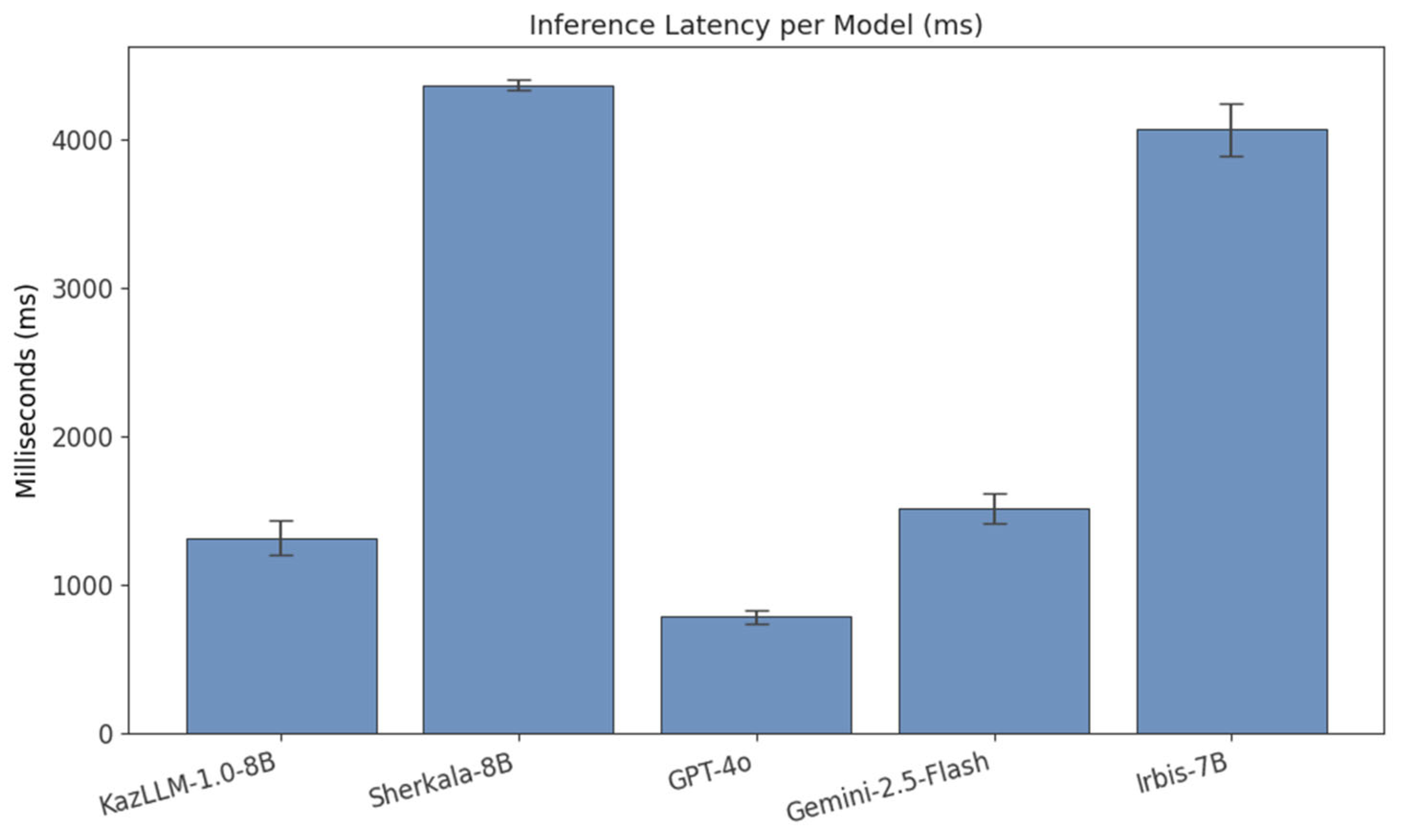 In the last few years, there has been a trend toward closing this gap. Several notable open-source models such as Sherkala [7], KazLLM [8], AlemLLM [9], and the model introduced by Kadyrbek et al. [10] have been developed specifically for Kazakh. These models reflect a broader shift from general-purpose multilingual LLMs to language-specific or regionally adapted systems, aiming to better capture linguistic nuance and improve performance in real-world Kazakh applications. However, their performance in QA tasks remain largely underexplored by different reasons. For instance, AlemLLM [9] has no accompanying publication detailing its architecture or training methodology, and its deployment requires substantial hardware resources—approximately eight NVIDIA A100 GPUs. Similarly, the model introduced by Kadyrbek et al. [10] is not openly released, and no public access or implementation link is provided, which limits reproducibility and broader community adoption.