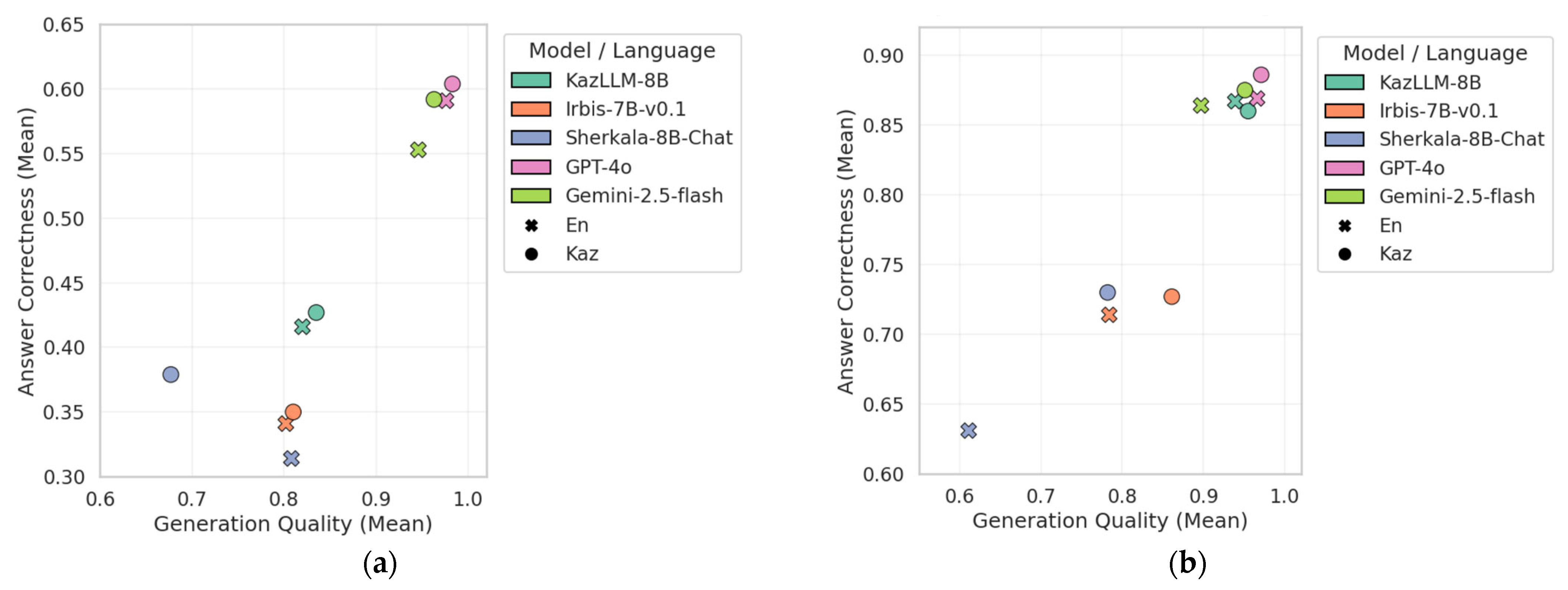 Further highlighting the challenges in Kazakh QA, Maxutov et al. [42] conducted a comparative evaluation of seven proprietary and open-source LLMs across multiple Kazakh NLP tasks, including question answering. Their findings show that the overall quality of LLMs on Kazakh tasks is significantly lower than on parallel English tasks. GPT-4 performed best, followed by Gemini and AYA, but even these models struggled with open-ended generative QA. The authors noted that LLMs generally performed better on classification tasks and often failed to generate accurate or complete answers in Kazakh, with Gemini showing a high rate of empty outputs.