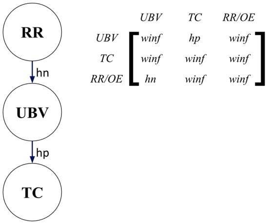 Figure 2 represents the WSJF FCM, which illustrates the relationship between the nodes of the fuzzy graph, considering the relationships between the variables Business Value to the User (BV), Risk Reduction or Opportunity Enablement (RR), and Critical Time (TC). In this context, the image illustrates the interdependence between the variables RR and UVB with a negative influence and, on the other hand, the interdependence between the variable UBV and TC with a positive influence.