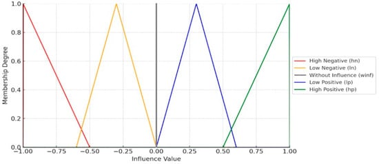 Table 3 presents the Linguistic Labels that have been defined, i.e., the semantic rule of the model. For greater clarity, the description of their membership range, their membership function and the degree of membership of each linguistic label have been included, taking values in the universe U = [−1, 1] according to the Bucket System Estimation scale and its set of terms T (influence) is: