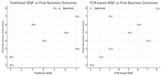 The correlation values were obtained by comparing the rank-order correlation (Spearman’s ρ = 0.711, p < 0.05) between the FCM-based model and real business outcomes, confirming statistical significance. Conversely, the linear WSJF model yielded ρ = 0.287 (p > 0.05), indicating a weak and non-significant association. Therefore, the 76% concordance refers to the overlap in ranking order, while the 24% residual variation identifies cases where nonlinear dependencies altered prioritization (notably alternatives a4 and a7).