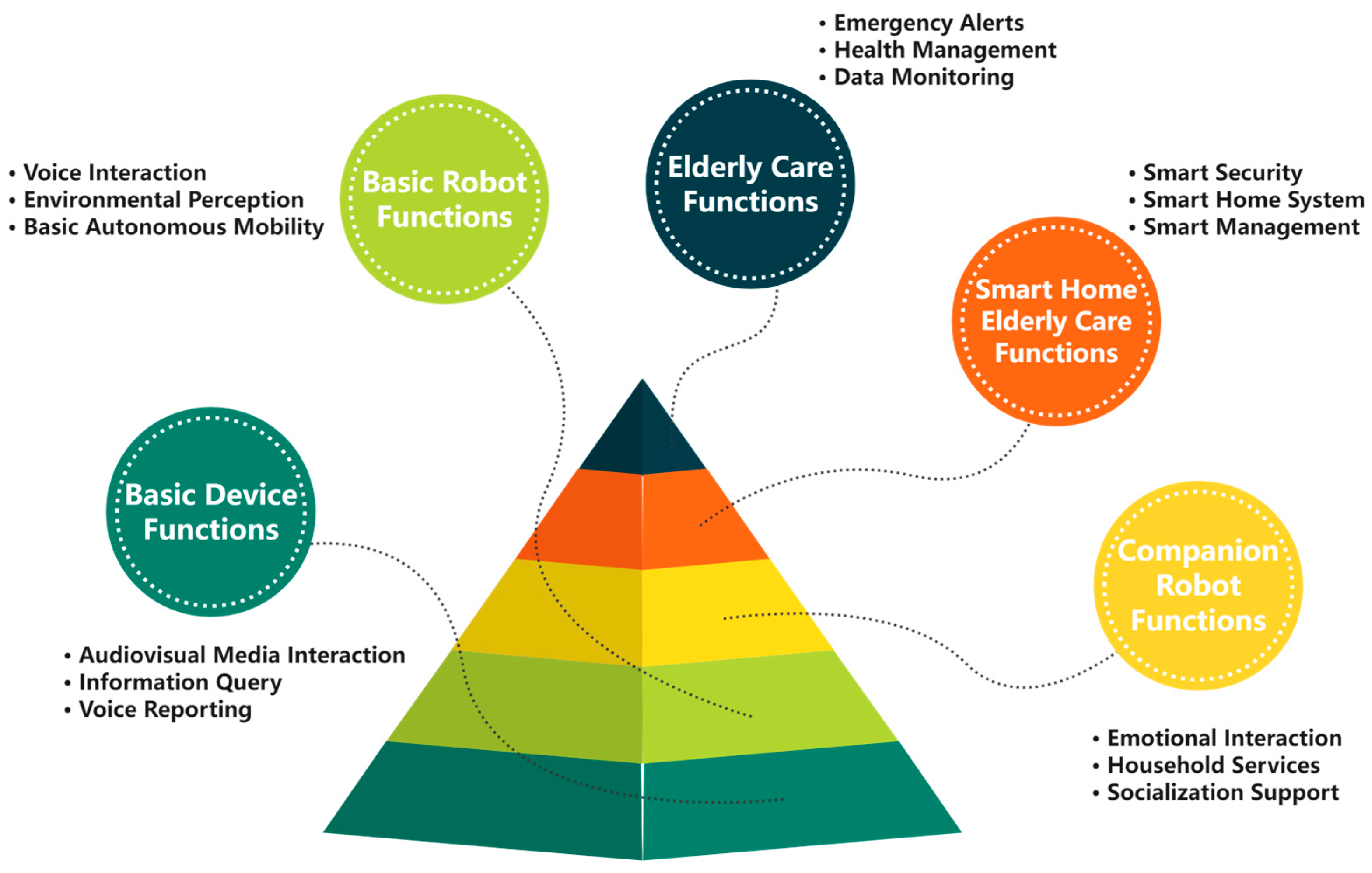 - The third tier consists of elderly care functions, focusing on core safety and health needs by providing limited-scope health management services such as fall detection, emergency alerts, physiological monitoring, and medication reminders [10].