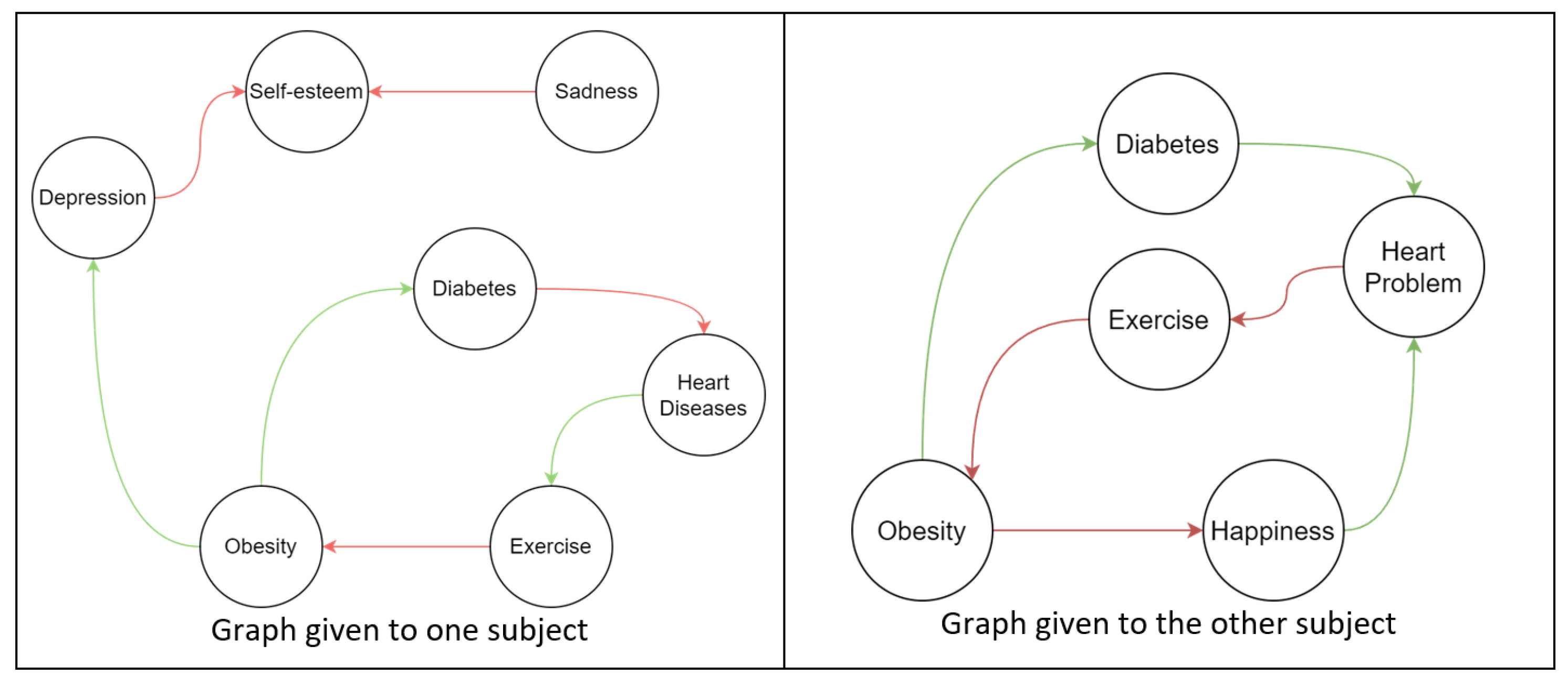 - Merging semantically related concepts. This is an important task to negotiate a shared meaning, as participants must find a pair of concepts that should be merged. The individual graphs contained a pair of closely related nodes (‘heart diseases’, ‘heart problem’) as well as a distractor pair (‘depression’, ‘happiness’). We expected this task to trigger a discussion and several software actions to select and move a concept onto its merging target. Merging related concepts is a well-known time-consuming modeling task, which is performed manually for small maps or increasingly benefits from AI solutions to identify potential concepts to merge in large maps [15,52].