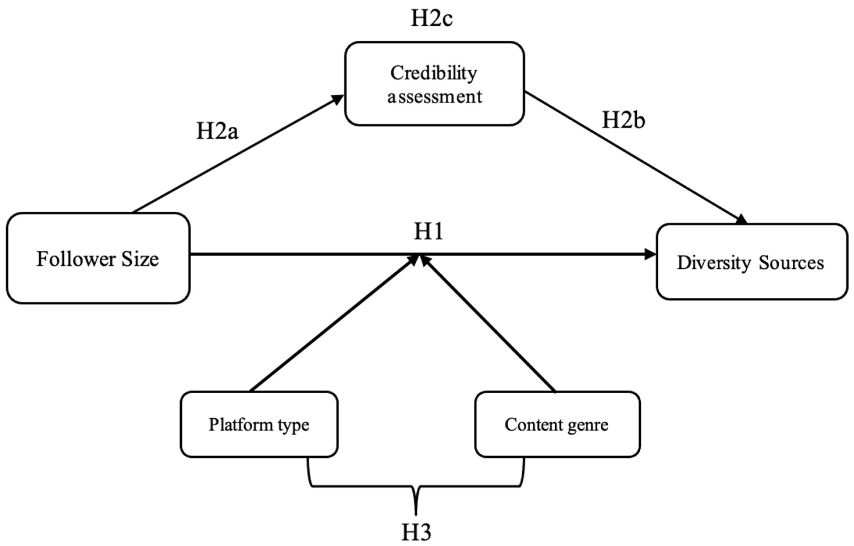 Empirical findings by Weismueller et al. [28] demonstrate that credible influencers generate more effective advertising endorsements, emphasizing the role of credibility in marketing success. Similarly, Omar AlFarraj et al. [29] find that trustworthiness and expertise are significant predictors of purchase intention in aesthetic dermatology influencer marketing, illustrating the practical importance of credibility in content creation. Greater structural capital (larger follower size) is expected to heighten the rigor of credibility assessment due to the higher reputational stakes and audience expectations; such increased rigor in credibility assessment by influencers should increase the diversity of sources used and hence mediate the follower size and source diversity. Thus, this study hypothesizes that: