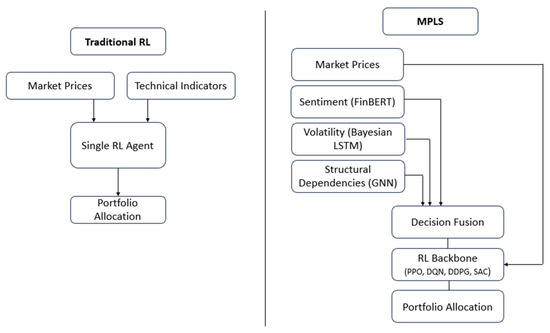 Traditional RL vs. Modular Portfolio Learning System (MPLS): architectural comparison.