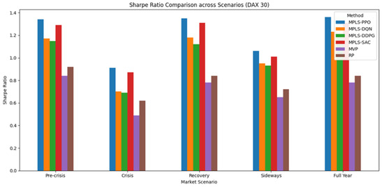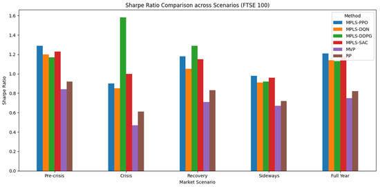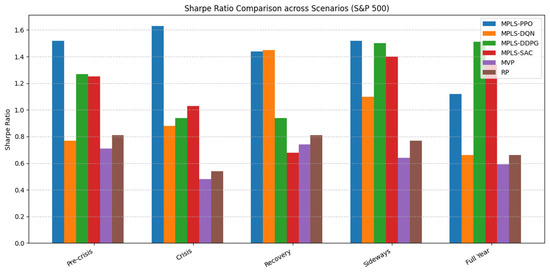 Robustness across multiple training runs is critical for the real-world deployment of RL-based systems. Table 8 reports Sharpe ratio variance across 10 independent runs, showing that, across all five scenarios, MPLS variants consistently achieved low variance. For example, during stable conditions, MPLS-PPO recorded a variance of 0.041, while MPLS-SAC reduced the variance to 0.046. This pattern extended to turbulent regimes such as the COVID crash (0.044 for PPO; 0.051 for SAC). These results confirm that MPLS not only enhances performance, but also training stability and reproducibility. Its modular design, Decision Fusion Framework, and Bayesian regularization collectively mitigate initialization sensitivity and noisy updates, ensuring more reliable retraining outcomes.