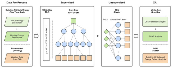 This study develops a hybrid AI framework that integrates supervised plus unsupervised models to benchmark building energy consumption across two time scales: annual and monthly. The framework is designed to (i) benchmark and predict energy performance with a balance between interpretability and predictive accuracy, and (ii) classify heterogeneous building stocks in a data-driven and unbiased manner. The methodology consists of four main stages: data acquisition and preprocessing, supervised prediction with linear (MLR) and tree-based ensemble learning models, including Random Forest (RF) and LGBM, unsupervised clustering using SOM, and interpretability analysis of key building attributes. MLR model is widely used in industry; therefore, it is set as the baseline model in this study. The workflow of this study can be illustrated in Figure 1.