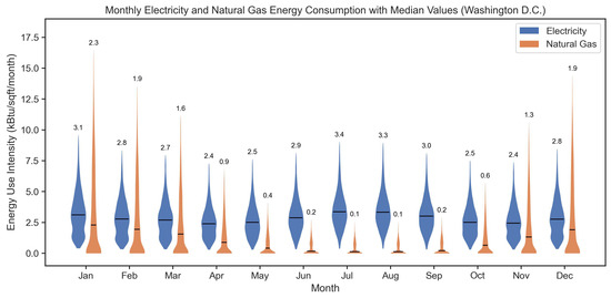 Data preprocessing is conducted in several steps. First, categorical attributes such as building type are transformed into a numerical format through one-hot encoding (OHE), ensuring compatibility with machine learning models. Second, continuous features, including energy use intensities (EUIs), are examined for skewness and normalized using a generalized logarithmic (GLOG) transformation, following [32]. Third, outlier detection is performed using a z-score based approach, removing approximately 8% of anomalous values in energy, construction year, and weather attributes, consistent with prior data-cleaning protocols in energy studies [33]. After cleaning, the dataset contains 9609 usable cases and 109 variables, forming a robust basis for subsequent analysis. The electricity and natural gas usage distributions among all 12 months are shown in Figure 2.