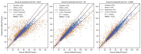 The initial supervised models are trained to predict annual site EUI. Figure 3 compares observed against predicted outcomes for baseline MLR (white-box) RF, and LGBM (gray-box). Additionally, Table 2 directly shows the three model performances and computing times. In Figure 3, the X-axis is the actual value, while the Y-axis is the predicted value. The blue dots in the two sub-plots from Figure 3 illustrate good predictive performance, meaning the errors are within 15% acceptance interval thresholds. The acceptance interval threshold for the building energy prediction approach was proposed by Li et al. [13] (2024) and has proven to be a reliable method for evaluating model performance. In this study, the threshold is set as 15% accordingly.