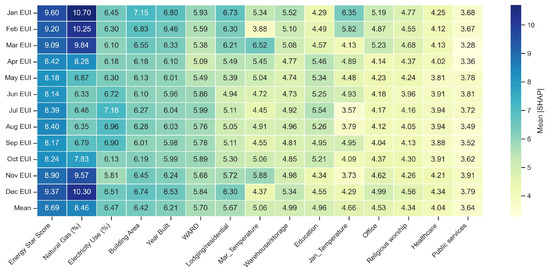 Figure 4 illustrates the SHAP sensitivity values for the top 15 predictive features across monthly LGBM benchmarking models. The heatmap highlights how the contribution of each variable to site EUI prediction varies throughout the year, revealing distinct seasonal and feature-level dynamics. Overall, Energy Star® Score, Natural Gas (%), and Electricity Use (%) consistently rank as the three most influential predictors, with mean SHAP values of 8.69, 8.46, and 6.47, respectively. These features collectively capture the fundamental energy performance characteristics of buildings—efficiency rating and fuel source composition—thus driving the model’s predictive accuracy across all months.