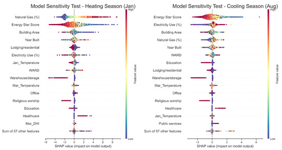 In the cooling season (right panel), model sensitivity shifts toward Energy Star® Score and Electricity Use (%), reflecting the dominance of cooling-related energy consumption. Higher Electricity Use (%) contributes positively to EUI, capturing increased electricity demand for air-conditioning. In contrast, Natural Gas (%) becomes less influential, with more balanced SHAP distributions. Building Area, Year Built, and Education remain moderately important, while the influence of temperature variables (March Temperature and January Temperature) reverses, as higher temperatures now correspond to higher cooling energy use.