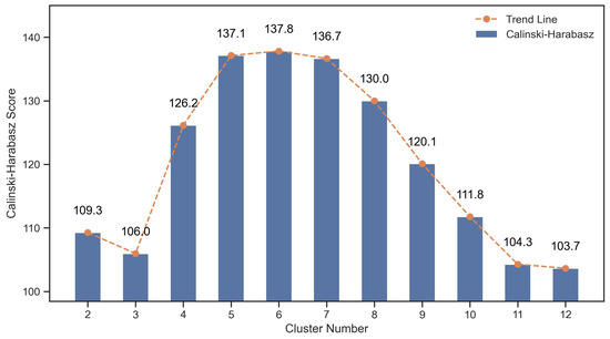 Figure 6 presents the Calinski-Harabasz (CH) score used to evaluate the optimal number of clusters for the SOM after supervised learning. The CH index measures cluster separation and compactness, where higher scores indicate better-defined and more distinct clusters. The results show that the CH score increases steadily from two to five clusters and reaches its peak at six clusters (137.8), followed by a gradual decline beyond seven clusters. This pattern suggests that partitioning the dataset into six clusters achieves the best balance between intra-cluster size and separation, indicating a well-structured clustering configuration for the subsequent analysis of building characteristics and energy use patterns.