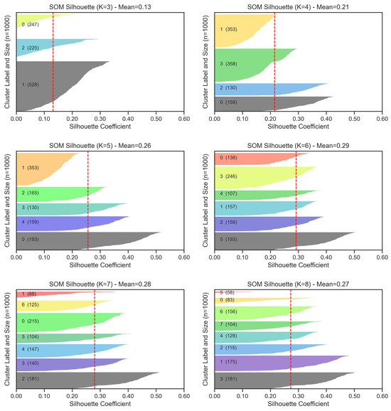 Figure 7 illustrates the Silhouette score distributions for SOM clustering models ranging from three to eight clusters. The Silhouette coefficient quantifies the degree of similarity within clusters relative to other clusters, where higher mean values reflect more coherent grouping. The average scores increase from 0.13 at K = 3 to a maximum of 0.29 at K = 6, before slightly decreasing at K = 8. The cluster shapes at K = 6 show distinct and well-separated boundaries with balanced sample sizes across clusters, confirming the clustering stability identified by the Calinski-Harabasz index. Therefore, six clusters are selected as the optimal SOM configuration for this study to characterize diverse building groups and their corresponding energy use patterns.
