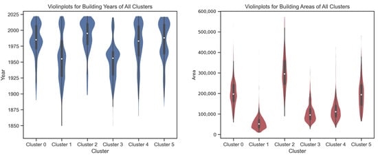 Figure 8 illustrates the distributions of building year and building area across all six SOM clusters, highlighting distinct physical characteristics within each group. The left violin plot shows that most clusters are composed of relatively modern buildings constructed after 1975, though Clusters 1 and 3 stand out with a wider range extending back to the early 1900s, indicating a mix of older and newer structures. Clusters 0, 2, 4, and 5 have median construction years around 1990–2000, suggesting that these clusters represent more contemporary building stocks.