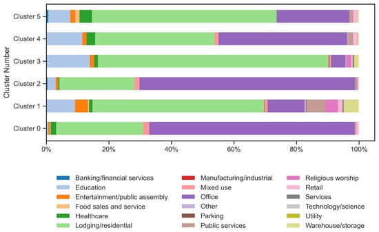 Figure 9 illustrates the distribution of building types across the six SOM clusters, revealing distinct and heterogeneous compositions for each group. None of the clusters exhibits similar type distributions, indicating that the SOM algorithm captures deeper structural and operational patterns beyond traditional building-use categories. Clusters 0 and 2 are dominated by mixed-use and other commercial types, whereas Cluster 1 contains a more balanced mix of lodging/residential, warehouse/storage, and service-oriented buildings. Cluster 3 features a high proportion of education and lodging/residential buildings, while Cluster 4 combines lodging/residential and office buildings with smaller shares of mixed-use and public services. Cluster 5, in contrast, is primarily composed of banking/financial services, lodging/residential, and healthcare buildings, suggesting a different group pattern compared to others.