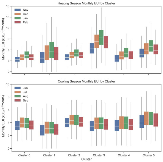 During the heating season (top panel), significant variations are observed among clusters. Clusters 1 and 3 show the highest median EUIs, suggesting that greater heating energy demand is likely associated with larger or older building stocks. In contrast, Clusters 0 and 2 demonstrate lower and more stable EUIs, reflecting either newer construction or improved envelope and system efficiencies. Clusters 4 and 5 maintain moderate energy use with narrower distributions, implying more consistent heating operation and better energy management practices within these groups.