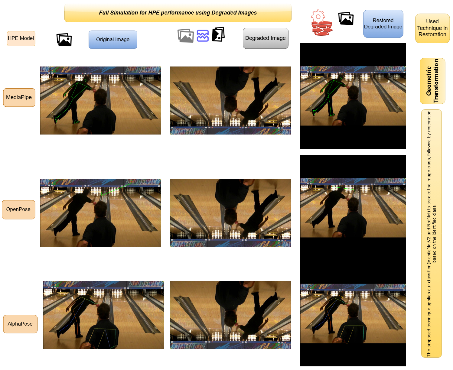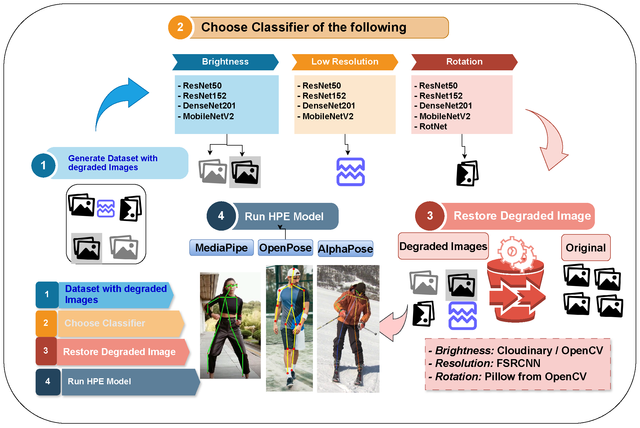 - We present an image restoration process to help enhance and reverse the degraded images to their original quality before feeding them into the HPE model for better pose detection accuracy. Together, these contributions improve the effectiveness and reliability of HPE systems in unconstrained real-world conditions.