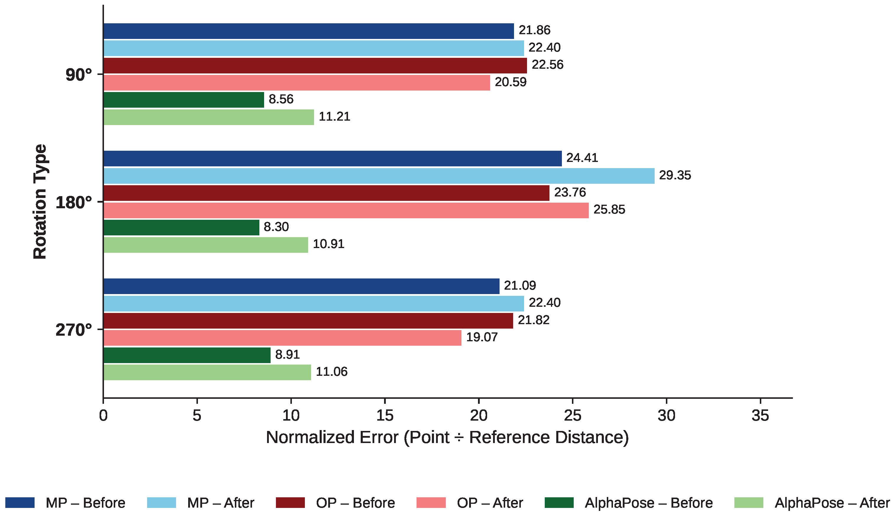 - Rotation Algorithm: This approach proceeded by applying image rotations with an affine transformation matrix, which was obtained based on the image’s center and a selected rotation angle from 0°, 90°, 180°, and 270°. To reduce image cropping during rotation, the method recalculated the image dimensions using trigonometric calculations that account for the change in orientation. The affine transformation matrix was then updated to ensure that the original image’s center is aligned with the center of the resized output, maintaining all visual content while avoiding distortion or data loss. Following image rotation, the method uses a geometric transformation to determine the predicted locations of human pose landmarks in the original image. A 2D rotation matrix for a given angle was defined using Equation (4):Using Equation (5), the original landmark coordinates (X, Y) are transformed into new coordinates (, ) after rotation.where there are rotations about the image’s center of rotation, these coordinates are translated so as to take into consideration this point of rotation.This approach provides a collection of expected landmark positions, which correspond to the predicted locations of the landmarks after rotating the original image by a specific angle. These produced coordinates provide a baseline for evaluating the accuracies of the HPE models’ landmark predictions for rotated images. The comparison illustrates how closely the predicted landmarks correspond to the expected positions, assessing the HPE model’s resilience to rotated inputs.