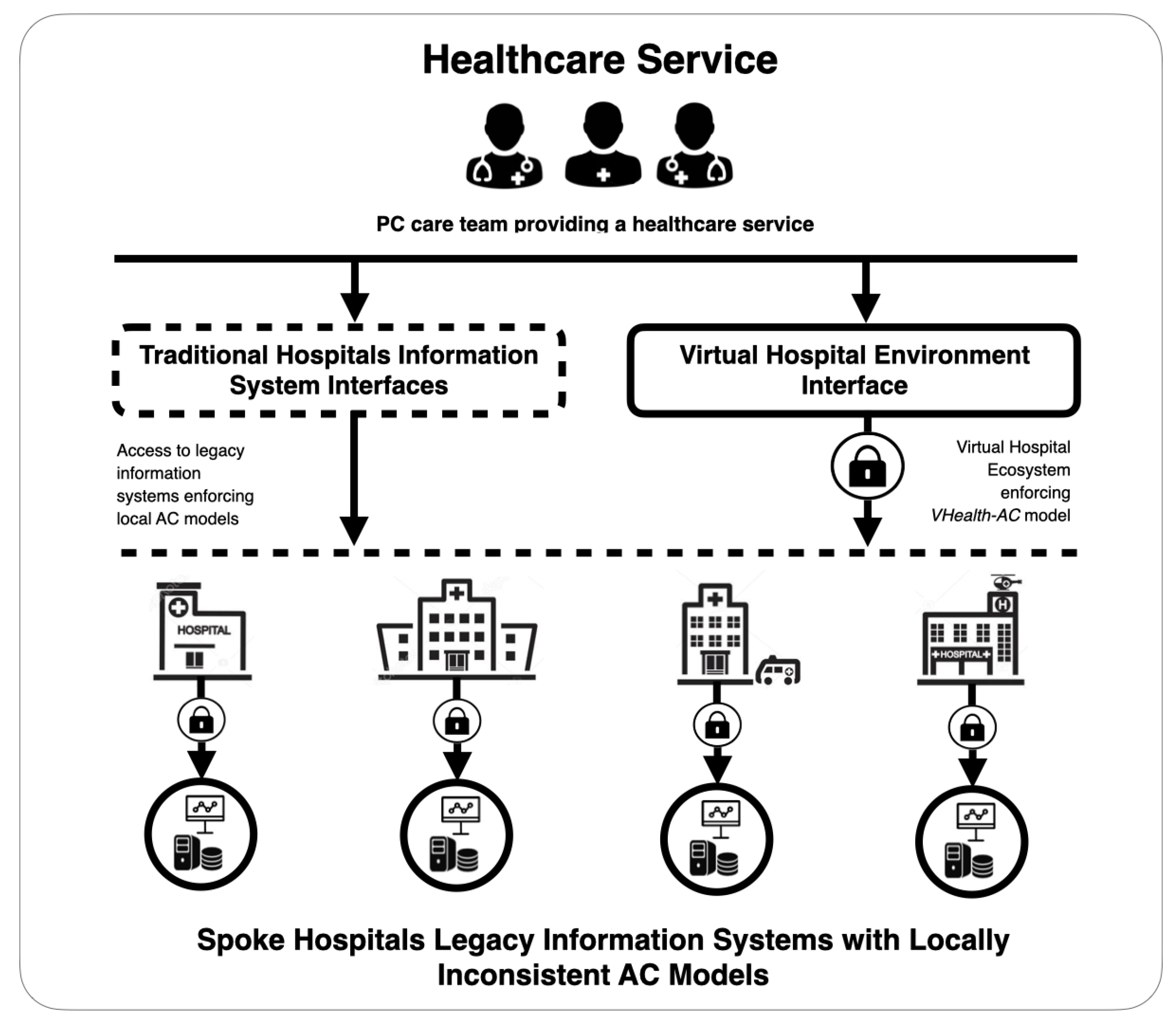 - Alsalamah, S.A.; Alsalamah, S.; Alsalamah, H.; Lu, C.T. Towards a Patient-Centered Virtual Hospital Ecosystem: A Fine-Grained VHealth-AC Model for Hospitals’ Legacy Information Systems. In Proceedings of the 2022 IEEE International Conference on Dependable, Autonomic and Secure Computing, Pervasive Intelligence and Computing, Cloud and Big Data Computing, Cyber Science and Technology Congress (DASC/PiCom/CBDCom/CyberSciTech), Falerna, Italy, 12–15 September 2022; pp. 1–8. [Google Scholar] [CrossRef]