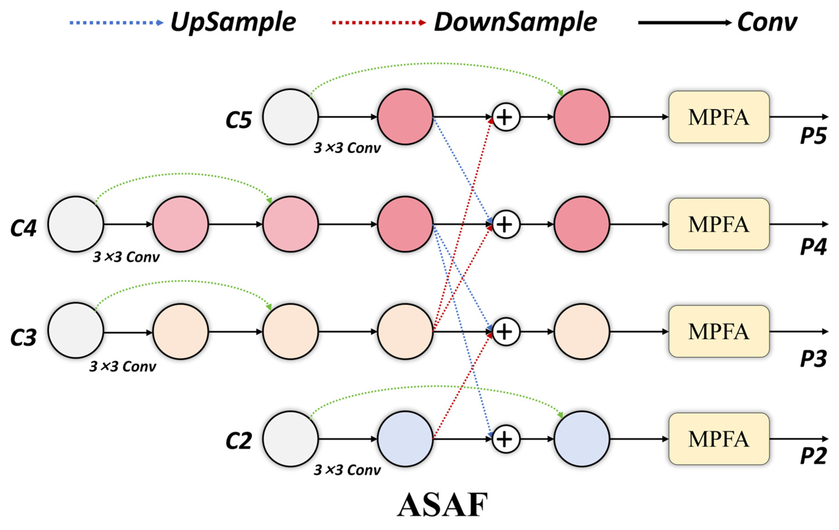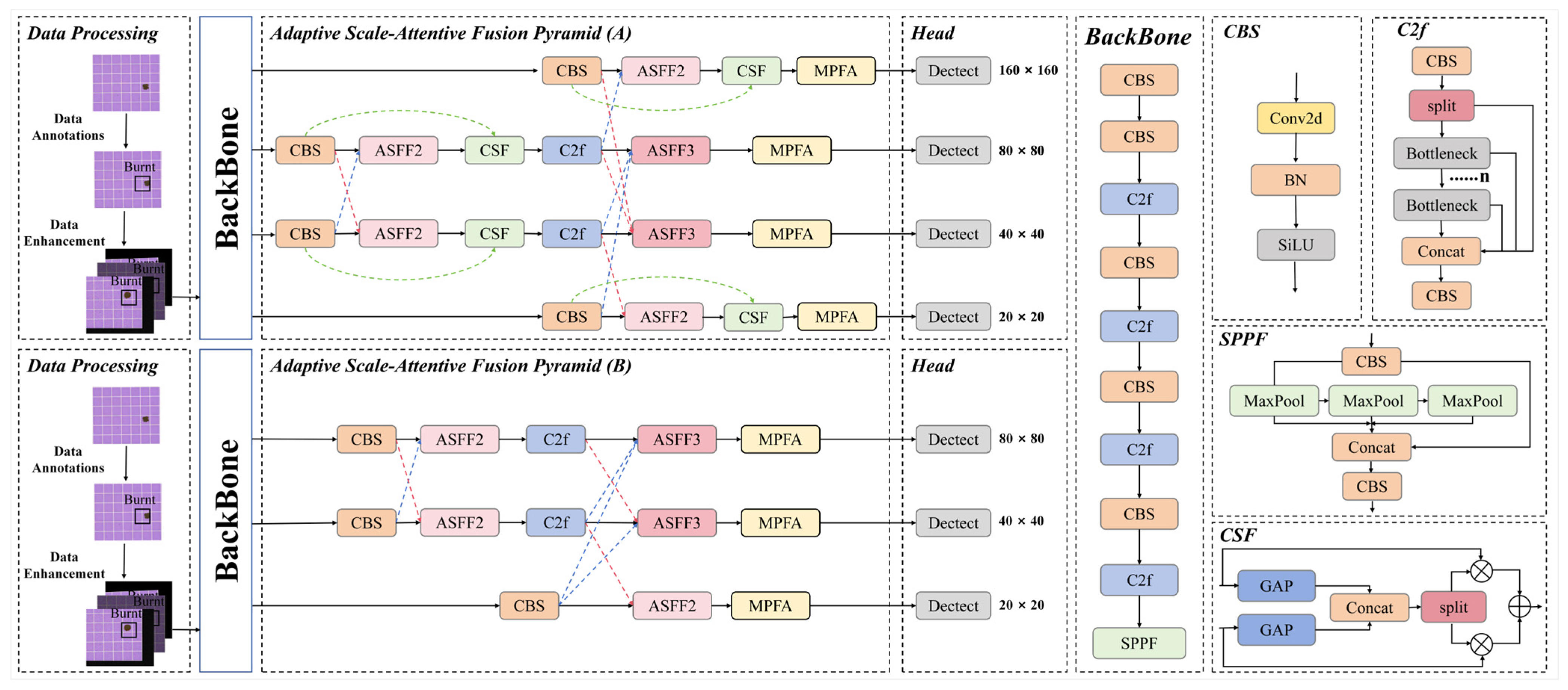 - ASAF-Pyramid (A) This is the primary and most powerful configuration. It introduces a dedicated, high-resolution P2 detection layer sourced from earlier, shallower feature maps. The P2 layer preserves the richest spatial details, which is paramount for the precise localization of micron-scale defects (e.g., charge trapping). Consequently, ASAF-Pyramid (A) employs four detection heads (P2, P3, P4, P5) for comprehensive defect detection across all scales, from the minutest to the largest.
