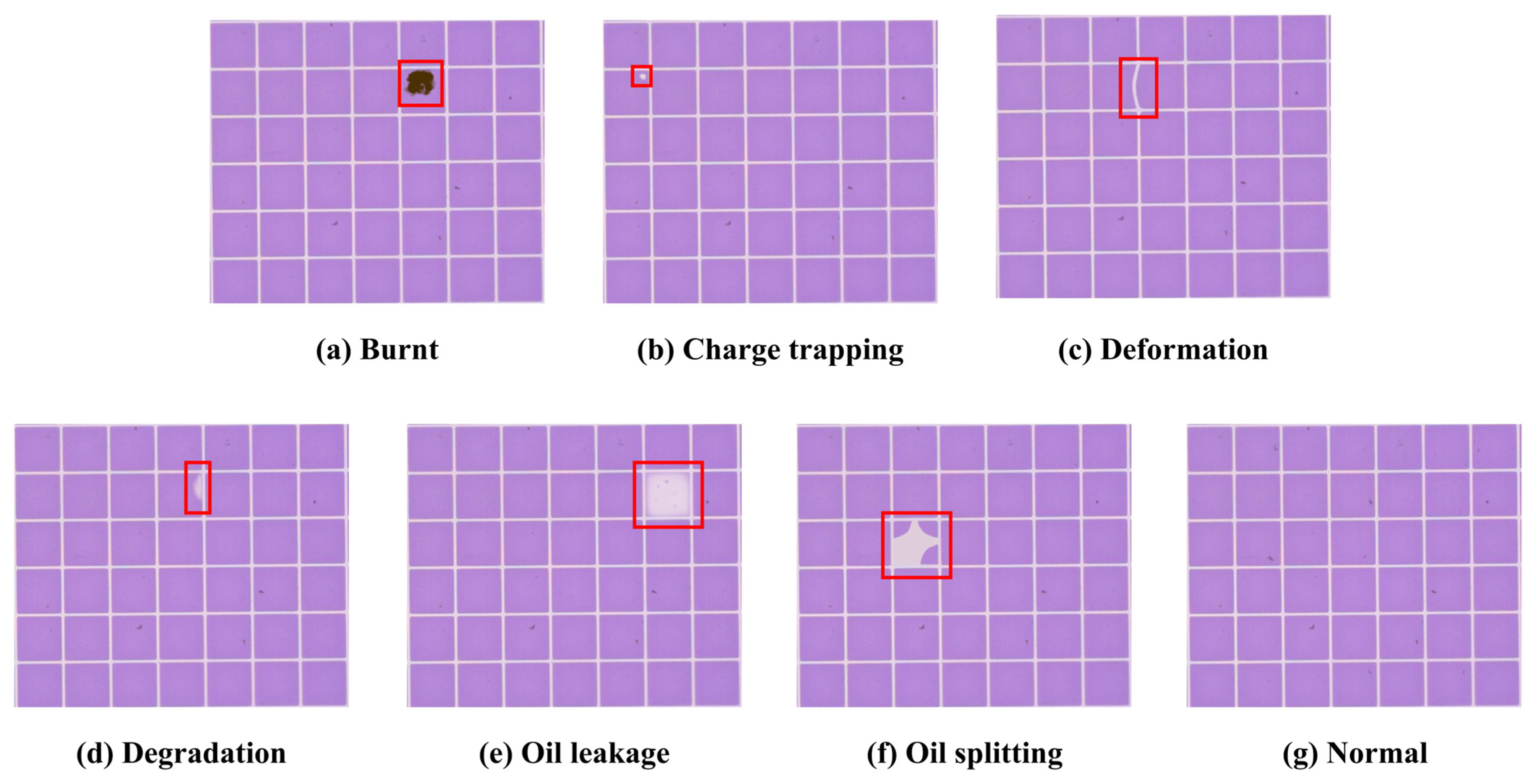 - Normal: This represents the ideal state of the device, characterized by intact pixel structures, an undamaged dielectric layer, proper sealing, and well-defined, controllable oil-aqueous interfaces, as shown in Figure 9g.