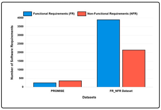 The PURE (Public REquirements) dataset consists of 79 publicly available natural language requirements documents collected from various online sources. It includes a total of 34,268 sentences and supports a range of natural language processing tasks relevant to requirements engineering, such as model synthesis, abstraction detection, and document structure analysis []. Ref. [] extracted and processed requirements from the PURE repository and additional open-source software documentation to create the FR_NFR dataset. This refined dataset contains 6117 requirements, of which 3964 are functional and 2153 are non-functional.