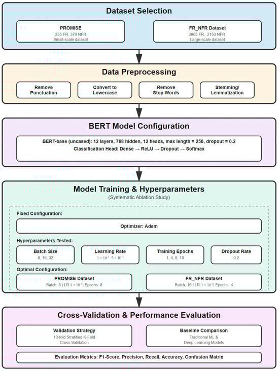 Researchers have proposed several approaches based on machine learning (ML), deep learning (DL), and transfer learning (TL) techniques []. Traditional ML has achieved good accuracy in classification tasks; however, some issues, such as dependence on feature engineering and a lack of contextual understanding, may arise with this approach. Other DL methods, such as CNN classifiers, have demonstrated high performance, particularly high precision, and recall, for NFR classification []. However, a major limitation of CNN models is their requirements of large, labeled datasets. Recent advances in NLP have significantly improved the field of requirements classification, particularly with the use of pre-trained language models like BERT, and its equivalents. Numerous studies [,] have examined the application of these models to automate the classification of software requirements. However, the optimal configuration of BERT for SRC tasks remains unclear, with limited understanding of which factors most significantly impact the performance during fine-tuning. This gap in knowledge often leads to suboptimal model configurations and inconsistent results throughout varying requirements datasets.